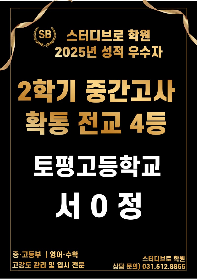 2025학년도 2학기 중간고사에서 토평고등학교 2학년 수학 전교 1등, 내신 1등급의 성과를 달성했습니다.