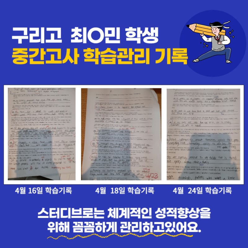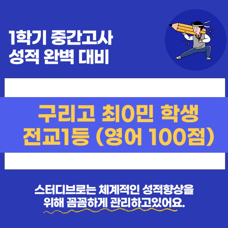 2년째 스터디브로 학원에서 영어 과목으로 재원 중인 구리고등학교 2학년 최○민 학생이 24년도 1학기 중간고사에서 전교 1등, 영어 100점을 달성했습니다.